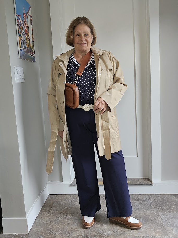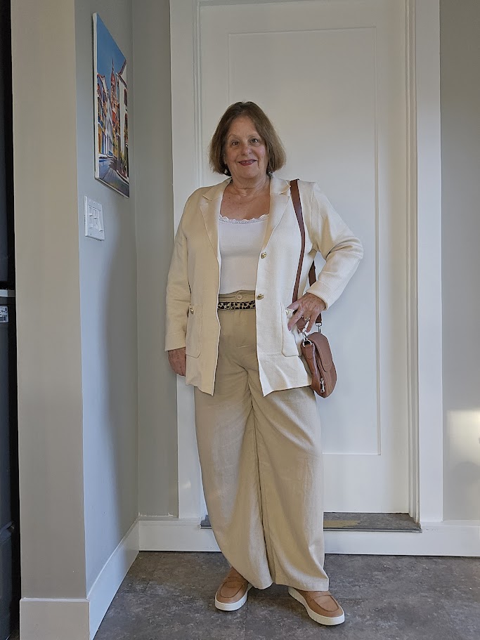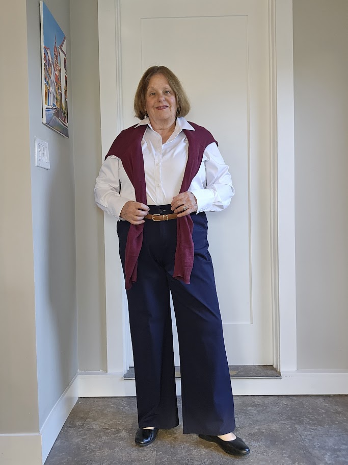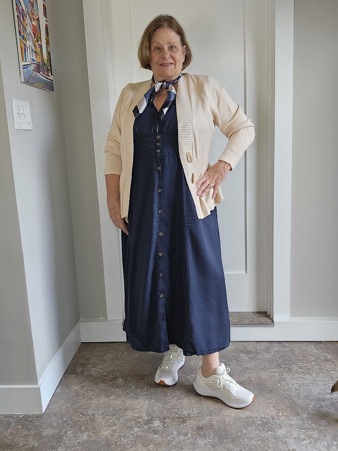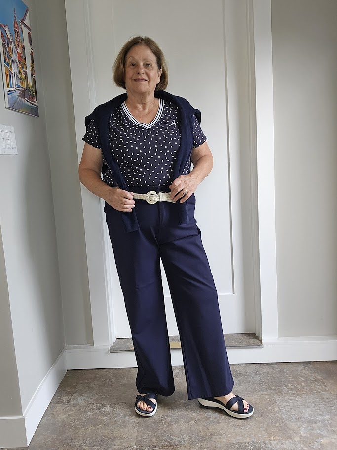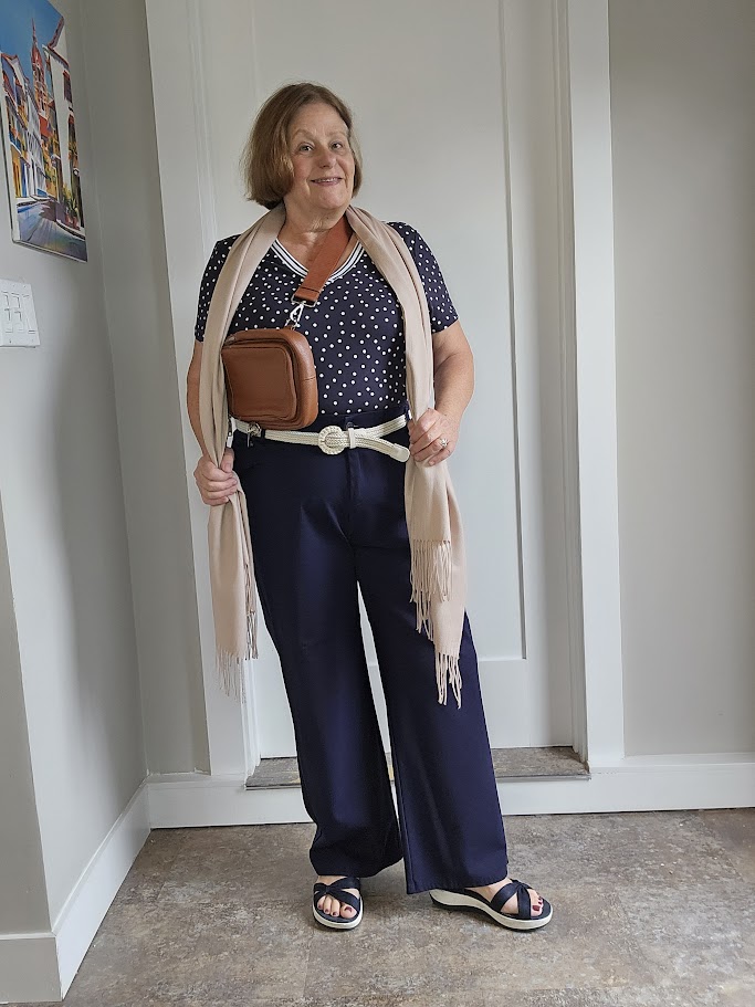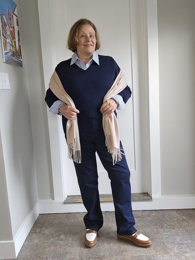 I’m an apple shape, with a protruding tummy, so I often wear a monochrome outfit of navy for the top and bottom and accessorize with tan tones or a pop of color. That might include a blazer, cardigan, shawl, shoes, or scarf.